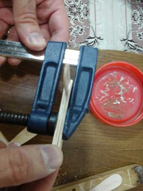 • Utilice una mordaza o pinza o incluso una pinza simple ojete, una banda de caucho alrededor de las asas como titular de junte todos estos palos de madera. Espere hasta que el pegamento es secado.