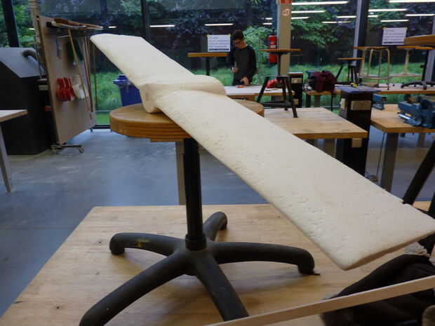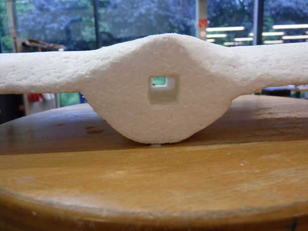Explora la espuma de poliestireno para el perfil de una superficie de sustentación (aerodinámica). En vista frontal, debe ser una protuberancia en el centro de las alas. Esto es donde se deslizará el casco (viga de balsa) a través. Corte el agujero (15x15mm) donde se ajusta el casco.