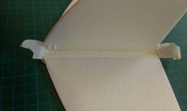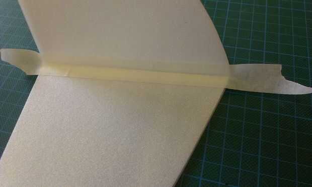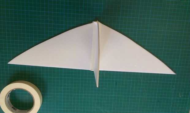 Zorg ervoor dat de vin mooi loodrecht op de staartvleugel staat. Plak de helft van de plakband op de vin en de andere helft op de staartvleugel. DIT doe je ook aan de andere kant.