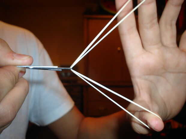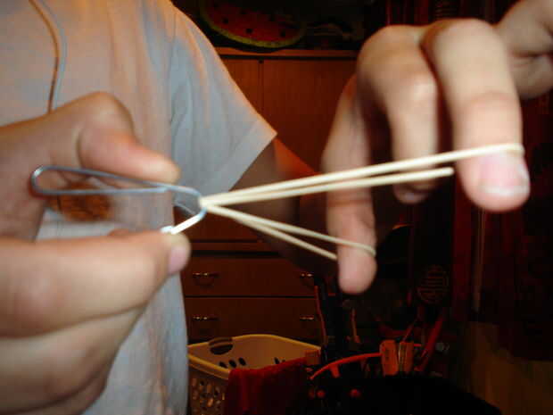 sostener la goma en el dedo pulgar y los dedos medios como en la imagen y el clip, como objetivo, dejar ir... 2 segundos más tarde en algún lugar en la clase de habitación "OUCH!!!!!!"