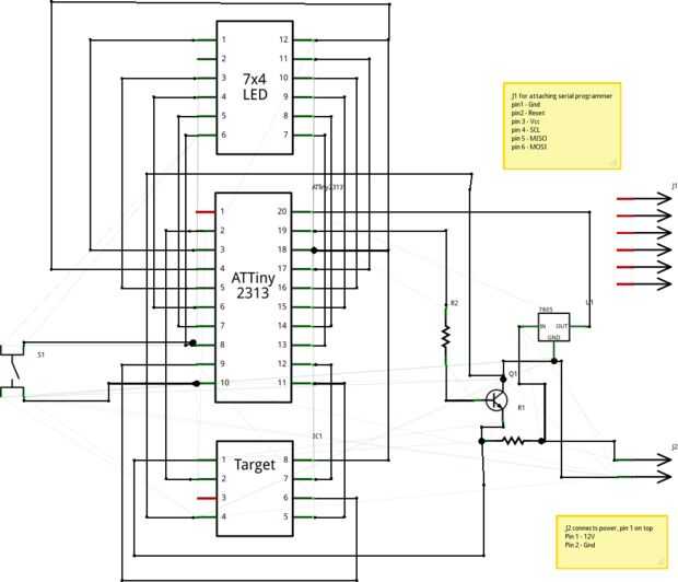 * las seis clavijas rojo ubicaciones aproximadas para una conexión de programador ISP, usted tendrá que conectar el 2 º (de izquierda) a la clavija 1 (RESET, cable azul) de la tiny2313 durante la programación. programación en circuito es un golpe y miss, ya nuestras programación pines están conectados a muchos dispositivos. por lo menos, usted necesita quitar el módulo led antes de intentar programar moda isp. Si falla, deberás quitar 2313 y tenerlo programado fuera de circuito.