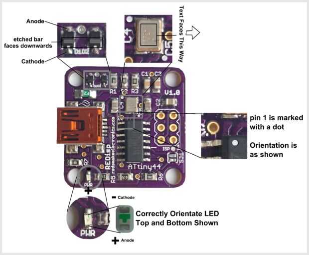 Las resistencias (R1-7), condensadores (C1-5), fusible y USB son no polarizados y puede ser soldado en a mano, aunque yo recomendaría una reanudación de la pistola de calor para el USB - los pins son inaccesibles con un hierro.