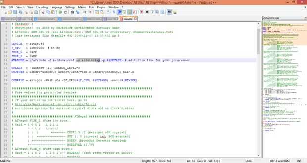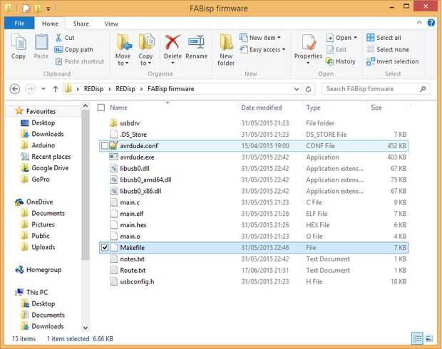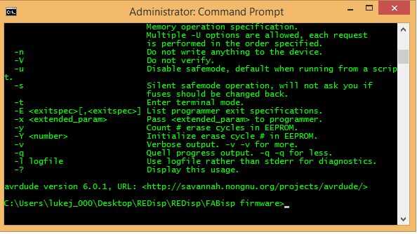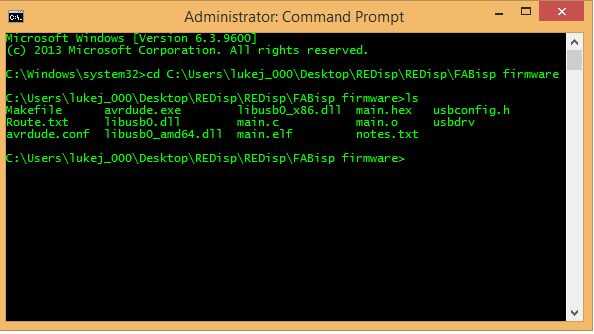 Para poder utilizar el sistema primero descargar la carpeta Fabisp Firmware archivo de arriba y asegurarse de que está todo en una carpeta como se muestra en las fotos. Dentro de la carpeta abrir el fichero MakeFile (utilicé notepad ++) y cambiar el programador al que va a utilizar como se muestra arriba (nombre de AVRdude). Utilizando la interfaz de línea de comando solicitada (CMD etc) vaya a la carpeta y primera ejecución "avrdude" para comprobar su funcionamiento correcto, asegurándose de que la Junta es listo y conectado vía el programador y eso SJ1 está cerrado, tipo "hacer programa" y ver la magia sucede durante 20 segundos. Primero escribirá el código y luego establecerá los fusibles. Programación hecho! Desconecte Quite SJ1 ahora para evitar una cabeza larga rayado momento tratando de averiguar cómo el ISP te da errores de programación sí mismo...