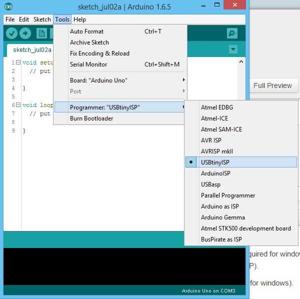 En Avrdude para utilizar el programador seleccione "-c usbtiny" como el argumento de programador en el comando, o desde el IDE de Arduino primero seleccione USBtinyISP en el menú de programadores y subir simplemente presione subir mientras mantiene shift ("subir usando programador" se muestra) se muestran dos imágenes.