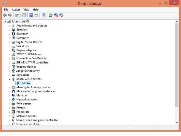 Siguiente a la llegada de todos OS que ha aparecido un nuevo dispositivo había llamado USBtinyISP (después de instalar los controladores para windows). En el administrador de dispositivos en windows (mostrados), perfil del sistema en mac y dmesg en linux.