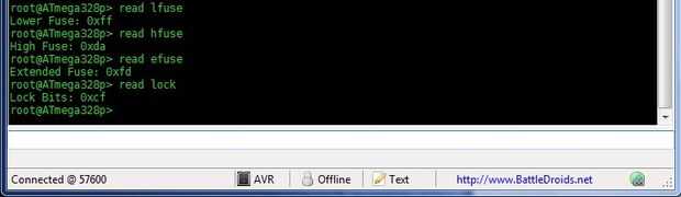 Por lo tanto, todos los bits se establecen en 1. Hice el mismo procedimiento en un clon de Arduino y tiene el mismo valor. Control de uno de mis sistemas independientes de AVR, conseguí 0xDA cual es el valor que me había marcado algunas tiempo atrás cuando se configura el chip.