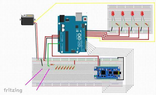 Los 4 LED es impulsado por los pines de arduino individuales con resistencias de 220 ohmios. También, dos del rojo que fueron de LED verde (la extrema derecha dos en el diagrama de Fritzing) pero el programa fritzing ni todo internet tenía LED verde parte de archivos. Mis disculpas pero si encuentras uno por favor hágamelo saber.