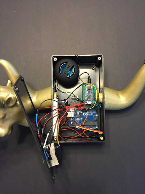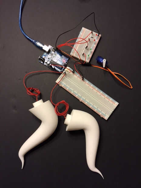 Como se puede ver por el diagrama de Fritzing, los cuernos (que se unen a los cables fucsias) son parte de un divisor de voltaje resistor. He usado resistencias de 8-10K ohm con el fin de proporcionar una gama más amplia de lecturas de voltaje de arduino (A0 cable de pin, verde).