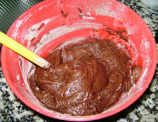 Después de eso, añadir la harina, el cacao en polvo y la pizca de sal. Asegúrese de que la harina es tamizada correctamente o que va a ser más difícil de mezclar luego.