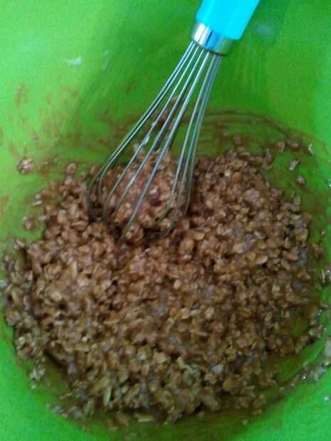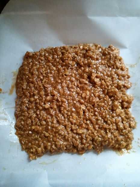 Es necesario pre-calentar el horno a 350 grados. Luego necesita aceite de la sartén con aceite de oliva, añadir un trozo de papel pergamino sobre él y añadir más aceite de oliva sobre el. Luego necesitas poner su huevo blanco en su bol y batirlo hasta que es espumoso. Luego necesitas: Añadir la mantequilla, el azúcar moreno, la miel y la mantequilla de maní y mezcle. Luego necesitas agregar la granola tiene y mezclar. Luego necesitas colocar la granola en el pan en forma cuadrada como se muestra en la imagen siguiente. Poner en el horno durante 15 minutos. Al sacarlo del horno y déjelo enfriar durante 1 hora al menos. Después de haber esperado una hora Coloque en un tazón y mezclarlo todo un poco con una espátula para hacerlo perder. Ahora ponerlo en la nevera mientras trabajas en la salsa de caramelo.