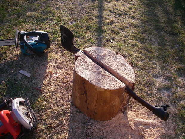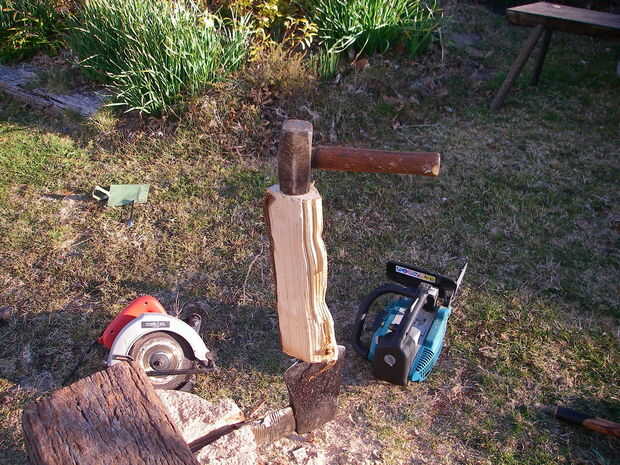 5. Coloque un peso pesado en la parte superior el mango de hacha para mantener en su lugar cuando usted comienza a dividir su madera. Sólo utilicé el viejo pedazo de durmiente de ferrocarril. Un segundo bloque de madera sería ideal como su altura haría que la configuración más segura si usted inadvertenly tropezó en la cabeza del hacha.