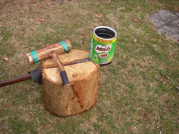 7. para hacer la configuración más segura, que usted puede recortar la parte inferior de un vacío Milo u otra lata y lugar la lata tubo sobre la cabeza de hacha para actuar como un escudo.
