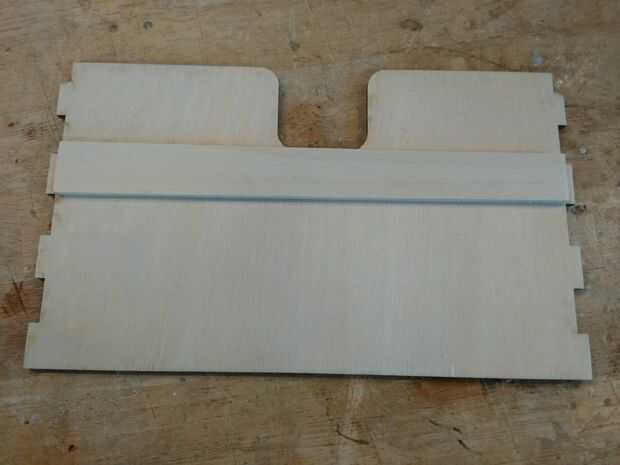 La rampa no se pega a los lados, porque queremos que sea desmontable para poder tener acceso al soporte cd. Para hacer la fuerte rampa, tenemos que pegar un pedazo largo de madera en la parte inferior de la rampa justo debajo de la hendidura (ver imagen). (Luego utilizamos una pieza extra de madera para hacer esto, pero para esta pieza está incluida en el actual archivo PDF).