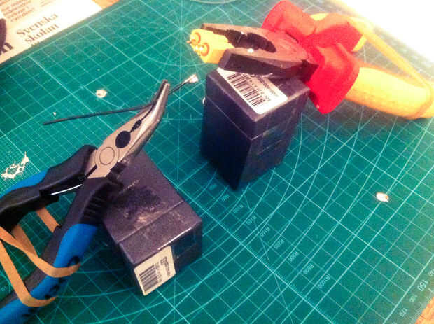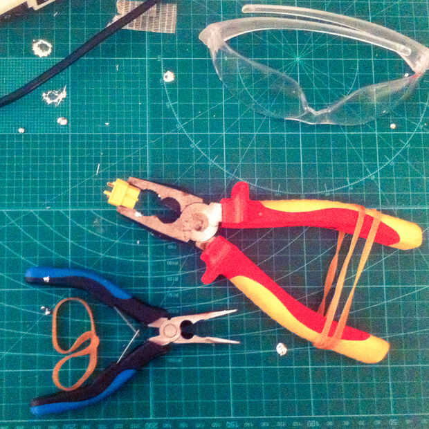 Agarra un par de pinzas y una robusta banda de goma. Envolver un par de veces alrededor de las manijas y voilá!