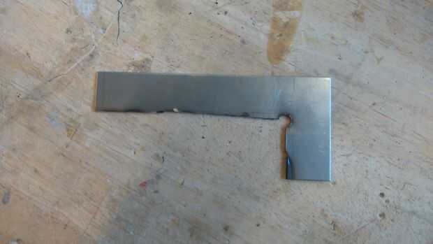 Primero comienza por cortar la forma L de la placa de acero con un esmeril. En la esquina de la L hemos perforado un agujero para asegurarse de que no cortar demasiado el robo.