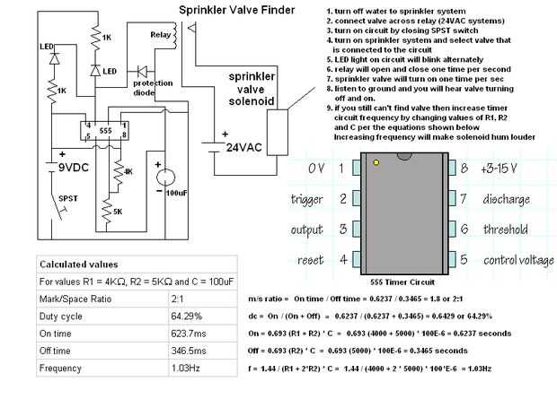 9. Si todavía no puede encontrar la válvula aumentar la frecuencia del circuito temporizador cambiando valores de R1, R2 y C por las ecuaciones que se muestran a continuación. Mayor frecuencia hará solenoide zumbar más fuerte.