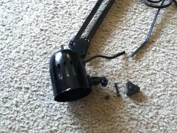 Al recibir la lámpara de escritorio iba pelar. Yo sabía que quería las manos ayudando a poner en el mismo lugar que la lámpara fue atada para que la luz tenía que ir. Fue bastante fácil sacar la lámpara. Todo lo que tenía que hacer era quitar la tuerca y tornillo y llegaron justo al lado. Yo quería probar y retire la lámpara sin tener que cortar los cables. Lamentablemente los cables donde clavado en la bombilla zócalo así me vi obligado a cortarlas. Luego se tira todo el cable fuera de la estructura del brazo del oscilación. Ahora estamos listos para unir las manos.