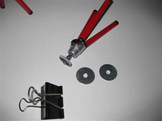 Las arandelas de defensa: (necesita dos): acero - 1 ¼ diámetro total externo; 5/16 diámetro exterior del orificio interno; 1/16 espesor. Estos no se encuentran en todas partes; una ferretería probablemente sería lo mejor para encontrar estos. Las arandelas de defensa funcionan bien para esta aplicación debido a su superficie plana. Creo que la varilla roscada en el trípode es un ¼ de 20. No es fundamental para conseguir la exacta lavadora; la función es sujetar la abrazadera para trípode.