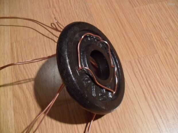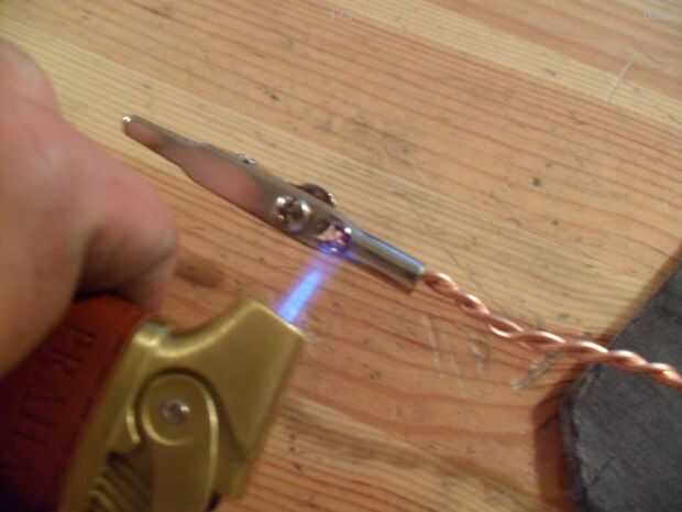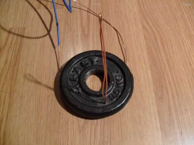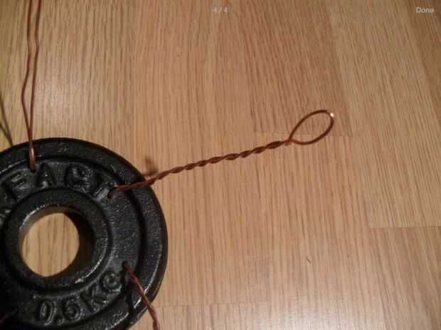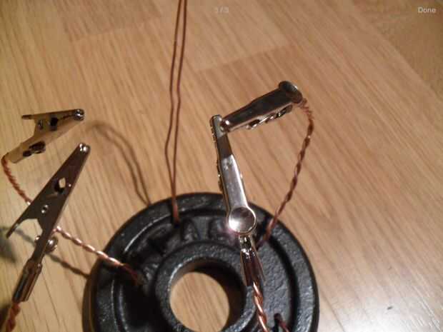 Empezar por 5 agujeros en la pesa. Entonces tira de 1 metro de alambre de cobre. Pase el alambre por los orificios para hacer 4 lazos para los ganchos de cocodrilos y una más para el ventilador. Tuerza los alambres para hacerlos más fuertes. Los clips de cuatro cocodrilos en el extremo de cada alambre trenzado de la soldadura. Soldar más rápido utilizar un encendedor.