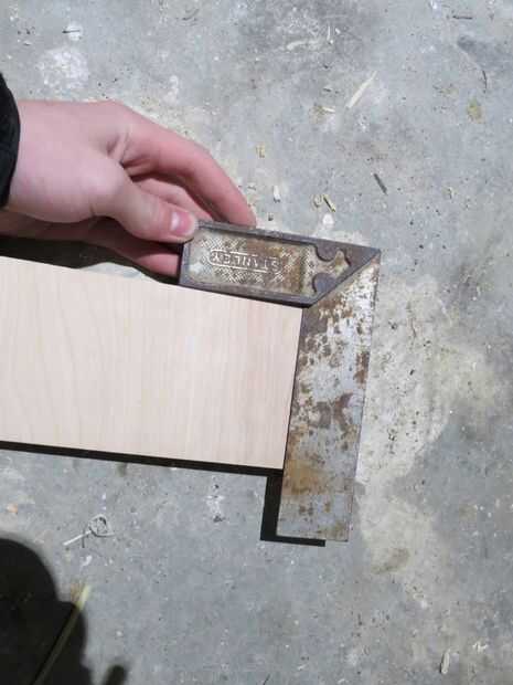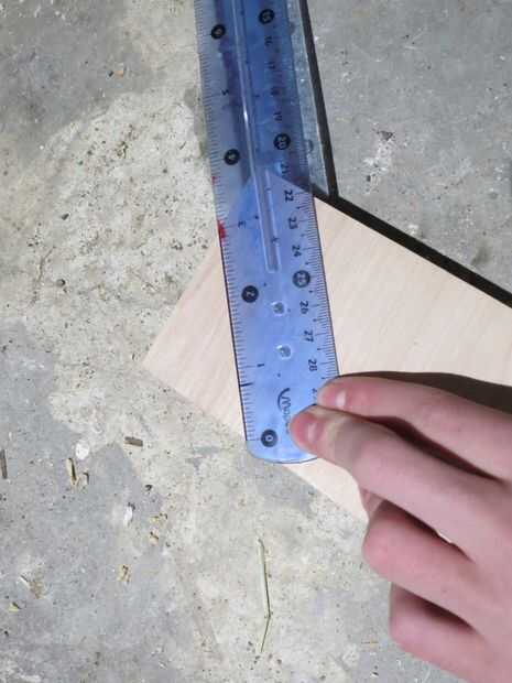 Dibujar un triángulo en la esquina de la madera contrachapada, asegurándose de que la esquina es de 90 grados. Hacer el lado más largo del triángulo unos 3-4 pulgadas de largo.