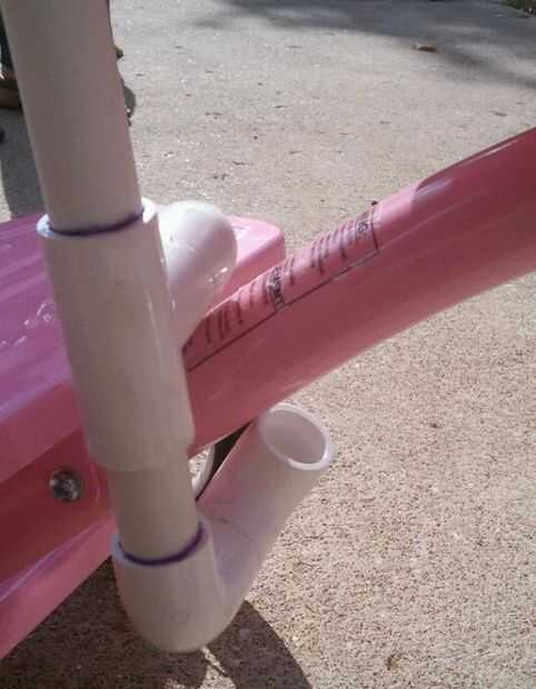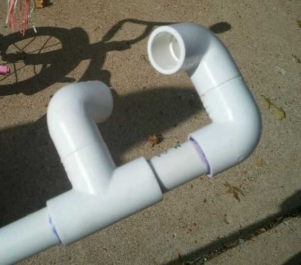 La idea aquí es hacer una especie de forma de C en el extremo de la longitud de la tubería. Los extremos abiertos deben estar en tal ángulo que puede caber alrededor del armazón del triciclo cuando el tubo es sostenido verticalmente, pero se bloquean cuando la tubería hacia abajo empujando o sosteniendo el trike.