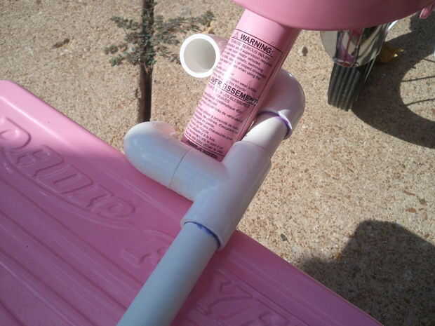 * Adjuntar la T + codo común hasta el final del tubo y globo ocular el largo necesario para acomodar la estructura del triciclo (quizás 2-4 pulgadas).