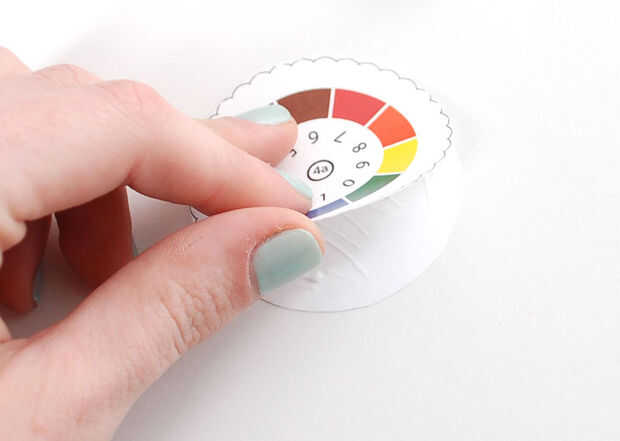 Corte y pegamento pares de ruedas de color de nuevo a la parte posterior. Pegamento líquido puede hacer que el papel de rizar un poco, por lo que recomendamos las ruedas bajo un libro pesado (o caliente del ordenador portátil) para secar aproximadamente una hora. O puede utilizar un palillo del pegamento!