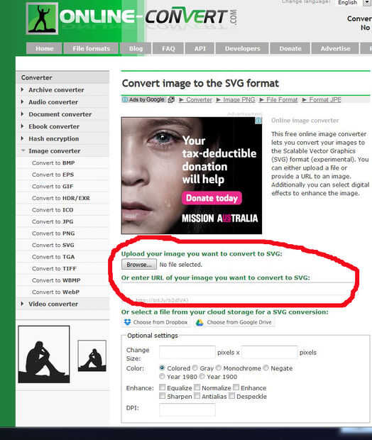 Tinkercad puede abrir dos tipos de archivos - STL y SVG, por lo que necesitamos convertir nuestro jpg en un archivo SVG antes de que podemos importarlo. Para ello utilice el conversor en línea en la página de apertura del convertidor, seleccione 'convertir a SVG' en el menú desplegable en la sección de convertidor de la imagen y luego utilice el botón Examinar para encontrar el jpg.