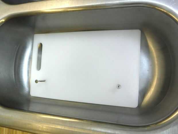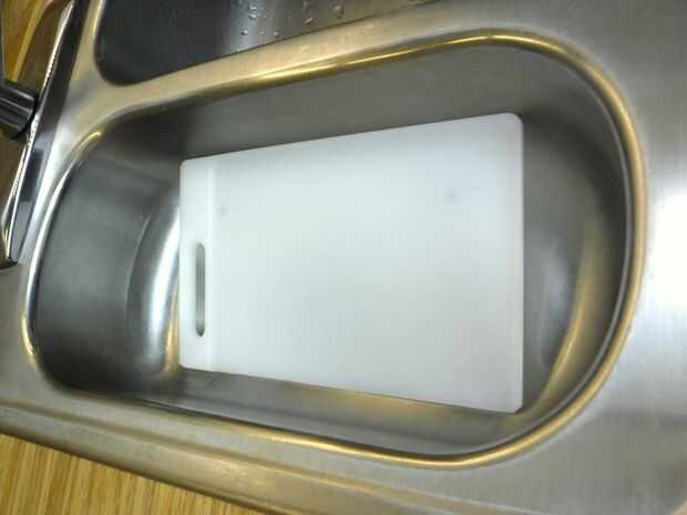 Tomando otra tabla para cortar polietileno cursi, cortarlo a no encajar. Un par de tornillos de ss en la parte trasera le dan un ángulo. No me importa si parece estúpido. Funciona mejor que cualquier cosa cuesta 30 veces más. Me salpican con lejía una vez por semana y preocuparse de otras cosas.