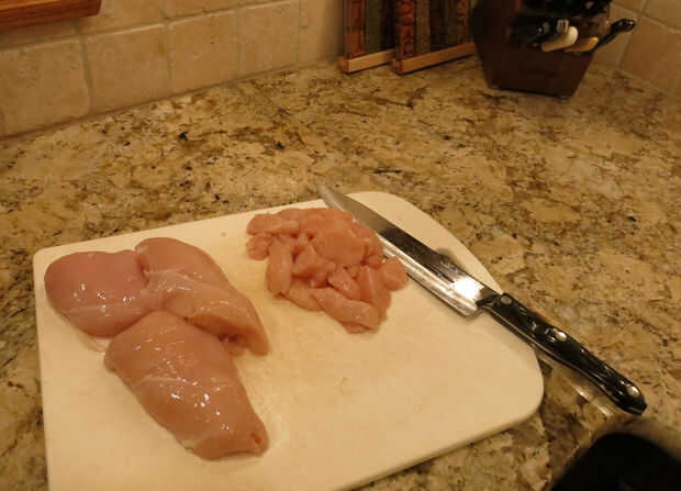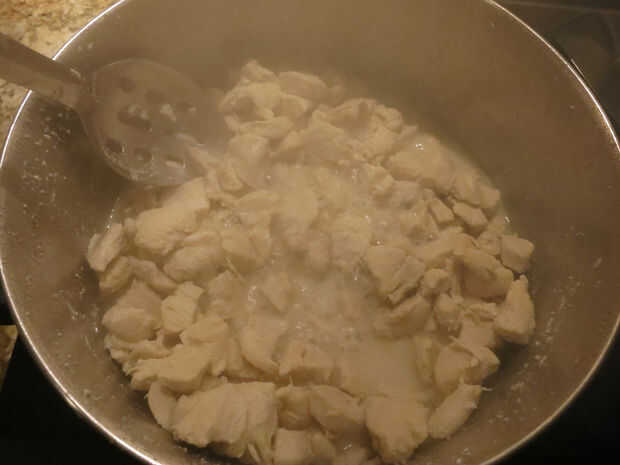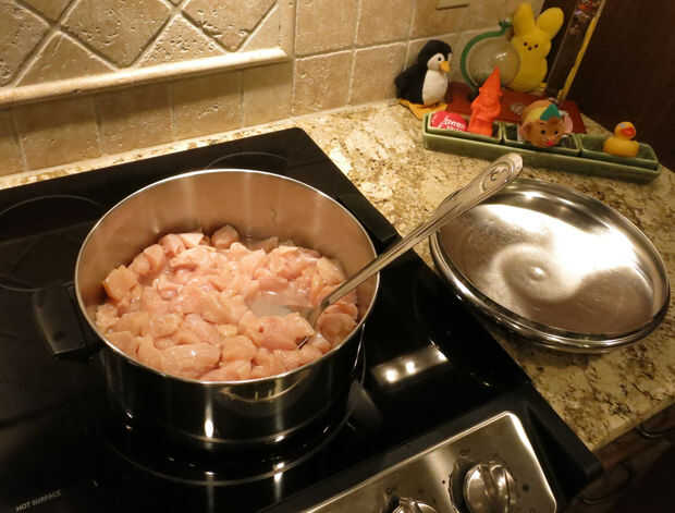 Nuestro ahumadero familia de propiedad y operación local es donde comprar pechugas de pollo sin hueso/sin piel, pero la mayoría departamentos de carne de tienda de abarrotes venden. A partir de pollo sin hueso/piel reduce enormemente en el tiempo de preparación. Generalmente empiezo con 6 mitades de pechuga de pollo, que rinde aproximadamente 18 porciones Tamaño muffin. Después de un rápido enjuague con agua fría, me corte el pollo en cubos y cocinar en una olla grande sobre fuego medio, agregar 2 tazas de agua, revolviendo con frecuencia durante 20-30 minutos mientras el agua cocina apagado.