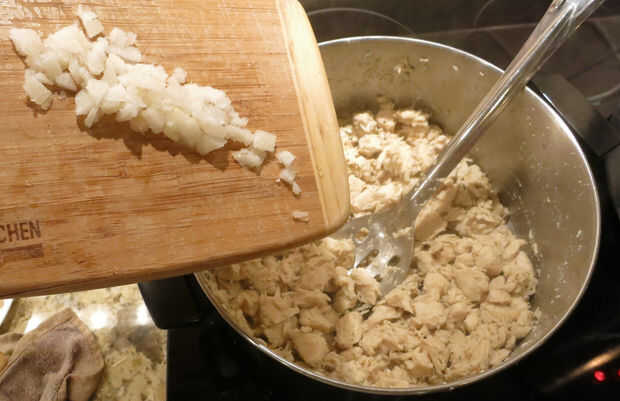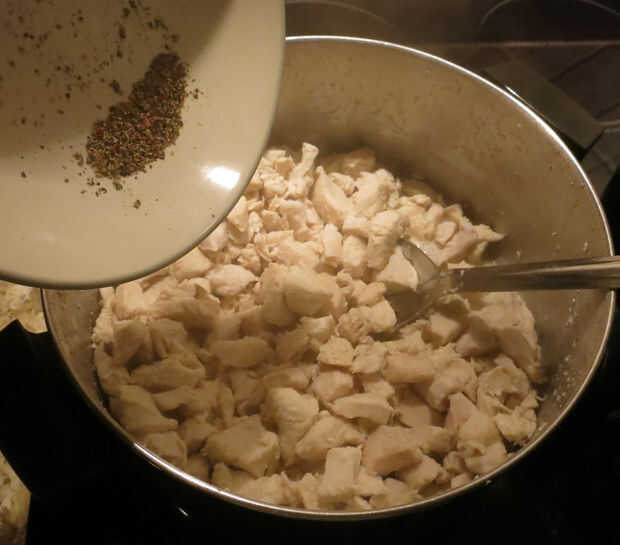 Después de las iniciales 2 tazas de agua ha cocinado apagado y el pollo esté cocido completamente, agregar sabores favoritos de la familia. Aquí he añadido 16 onzas de caldo de vegetales, 1 taza de cebolla picada y una mezcla de especias y hierbas. Revuelva y continuar la cocción a fuego medio hasta que el líquido desaparezca, generalmente otros 20 minutos