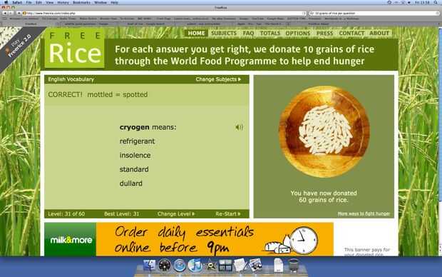 Según las Naciones Unidas, un niño muere cada 10 segundos de hambre relacionadas con causas. Aunque 10 granos de arroz puede parecer una pequeña cantidad, es importante recordar que mientras estás jugando, así que son miles de otras personas al mismo tiempo. Es todos juntos que hace la diferencia. Gracias a ti, FreeRice ha generado suficiente arroz para alimentar a millones de personas desde que se inició en octubre de 2007."