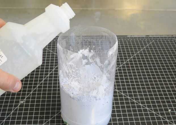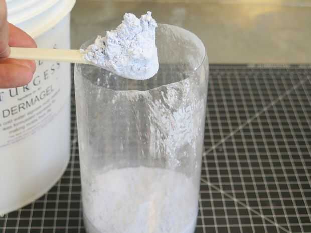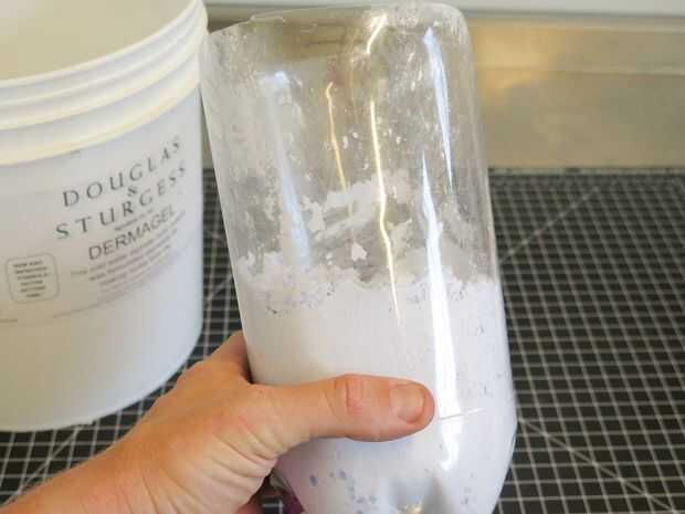 Primicia algunos dentro de la botella que usted piensa que puede rodear la mano (un poco menos de la mitad de volumen), añadir agua y mezclar. Usé una marca llamada "Dermagel" de Douglas y Sturgess y recomiendan agregar 1 parte alginato por 1,5 partes de agua por volumen, pero me parece que puedo obtener buenos resultados por solo ojo-Ball lo con el objetivo de una mezcla de batido y goopy.