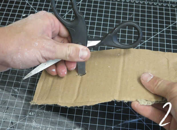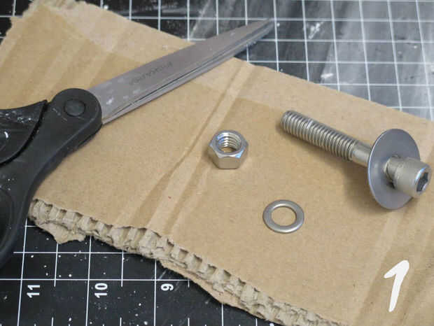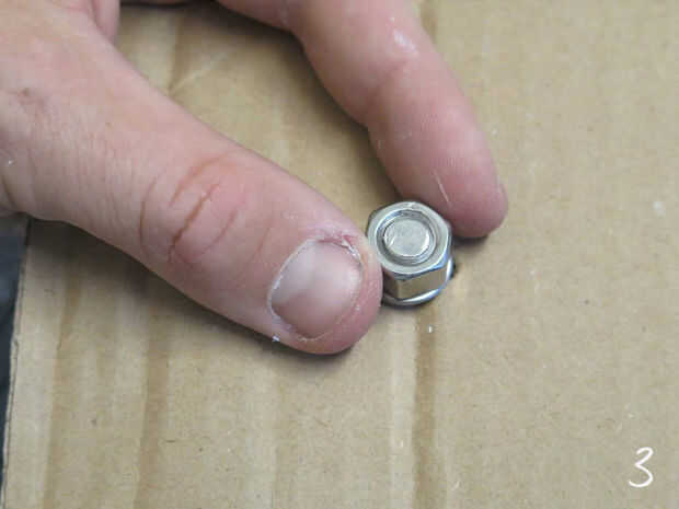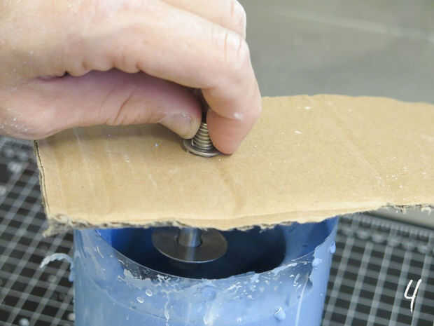 Es hora de perno! Vamos a ajustar un tornillo en el dorso de la mano del elenco, pero vas a necesitar un pequeño apoyo para hacerlo. Hacer un agujero en un pedazo de cartón con unas tijeras (2). Luego deslice una arandela ancha en su perno y empujar a través de la cartulina. Sujete con una tuerca (3) y asegúrese de que el tornillo de mano baja bastante en tu molde para ser profundamente en el hormigón (4). Recuerde, la cabeza del perno dentro del concreto. Ya lo tienes!