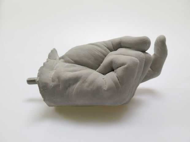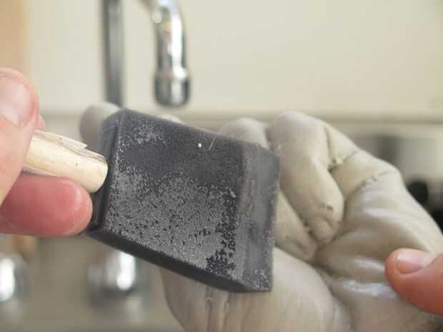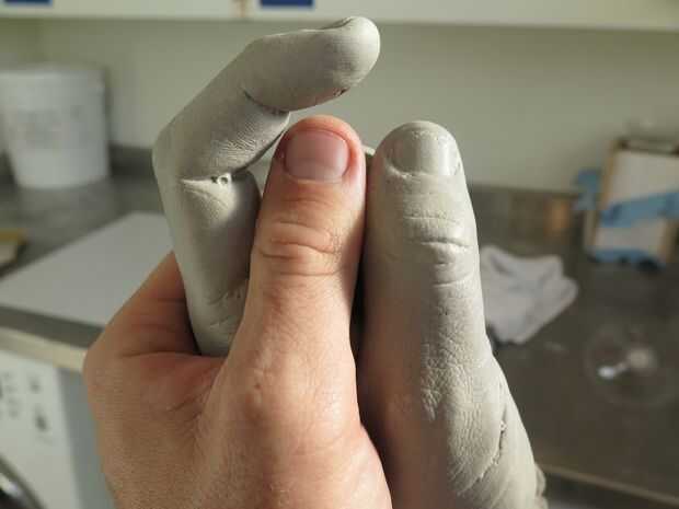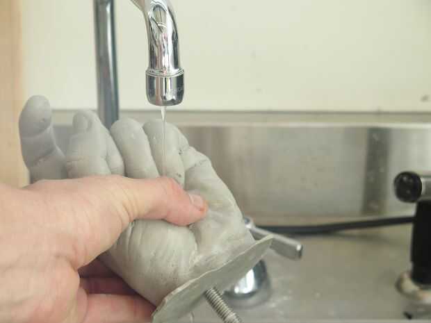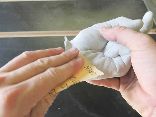 Comenzó con un poco de agua y un cepillo para quitar el polvo de concreto y alginato y terminado para arriba con lijar las esquinas alrededor de la muñeca para que sean agradable y suave.