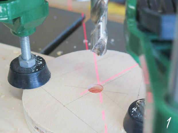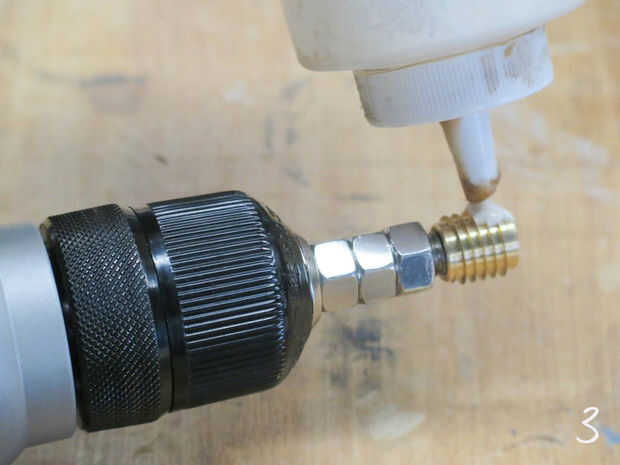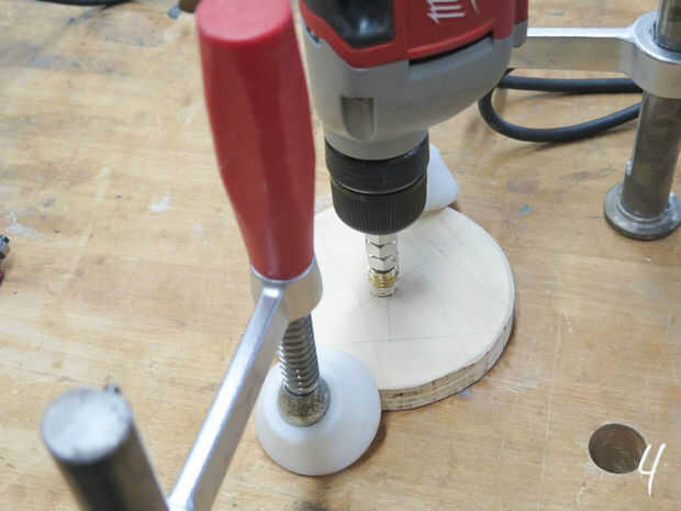 Compruebe el tamaño de su inserto roscado y perfore un agujero ligeramente menor que en el centro de la madera (1). Atornille el accesorio de inserción en tornillo de otra del mismo tamaño (2), añadir algún pegamento (3) y entonces utilice un taladro para conducir hacia abajo en la madera (4).