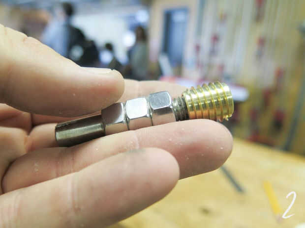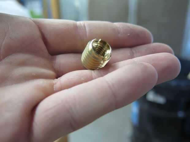 Este es un pequeño gran pedazo de hardware llamado un "inserto roscado". Es adorable. Parece un gusano de latón stumpy. También va en nuestro Monte.