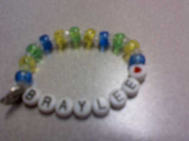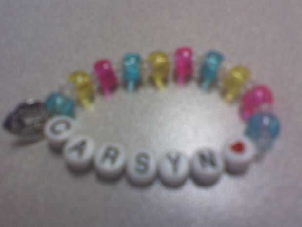 Mis nietas les encanta crear sus propias pulseras únicas. Comenzamos con estiramiento cadena de la tienda de hobby y luego se mide la longitud que deseamos y empezar a crear uno de una pulsera tipo. A veces ponemos sus nombres sus o escojan granos brillantes y cadena de todo tipo de encantos, cuentas y letras a nuestro gusto. Son muy baratas de hacer y llevan bien.