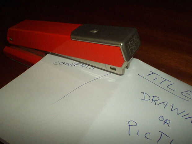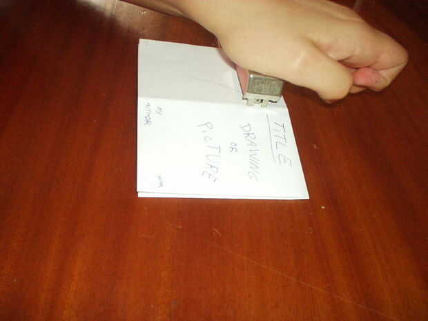 Doblar la hoja otra vez en la forma de mini libro y utilice la grapadora para mantener las páginas juntas, como se muestra a continuación.