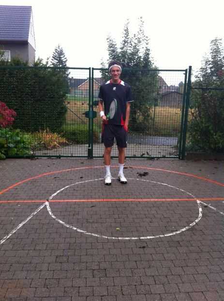 Bij de opslag zorg je ervoor dat je achteraan het veld staat op de witte lijn. Hierbij sta je niet het midden maar aan de rechter-de linkerkant van het midden.