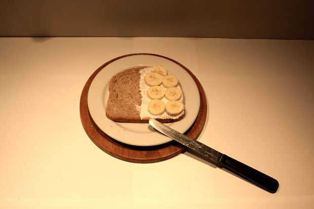 Nu pierna je een paar schijfjes banaan op je boterham met kaas platte.