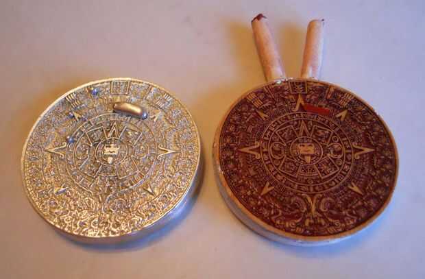 La moneda de estaño se muestra con el diseño original de madera grabada con láser.