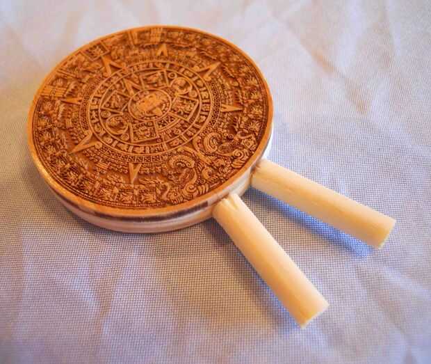 El modelo es creado por pegar el diseño de Azteca grabada con láser para un 1/4" pieza de contrachapado de abedul que se corta y lija para emparejar el laser cut diseño de Azteca.