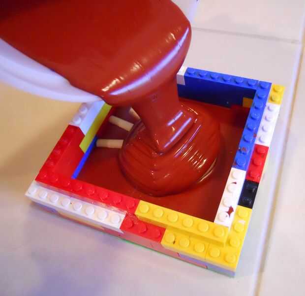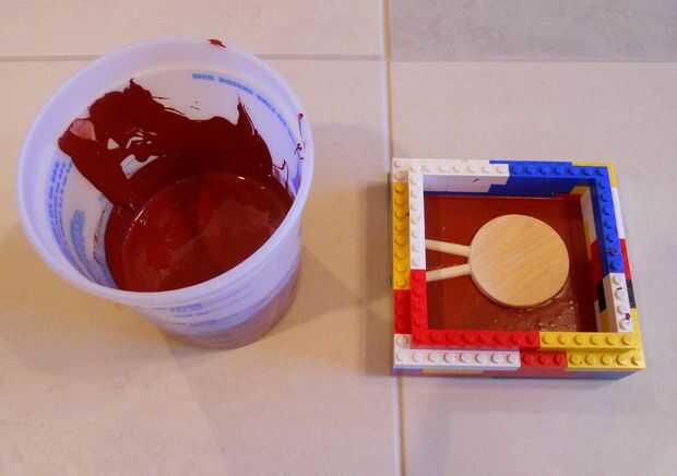 El modelo de madera se coloca cuidadosamente en el caucho RTV líquido hasta aproximadamente la mitad está cubierta. El modelo de madera fue suspendido en este nivel a través de varias cadenas pegadas al modelo y a los lados de la forma de Lego.