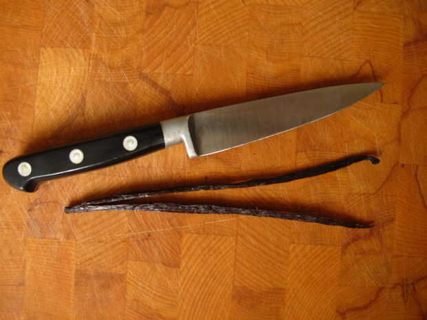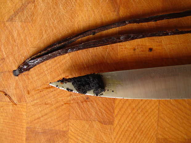 Cortar las vainas de vainilla por la mitad y raspar las semillas con su cuchillo.