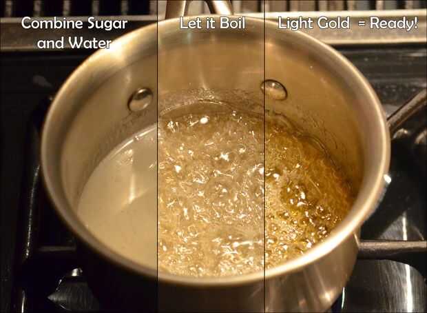 Combine el azúcar y el agua en la cacerola y cocinar a fuego medio. NO REVOLVER!