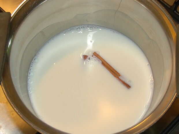 Vierta la leche en una cacerola y añadir los palitos de canela. Caliéntelo suavemente hacia arriba (casi hirviendo). Apagar completamente el fuego y deje reposar 15 minutos.