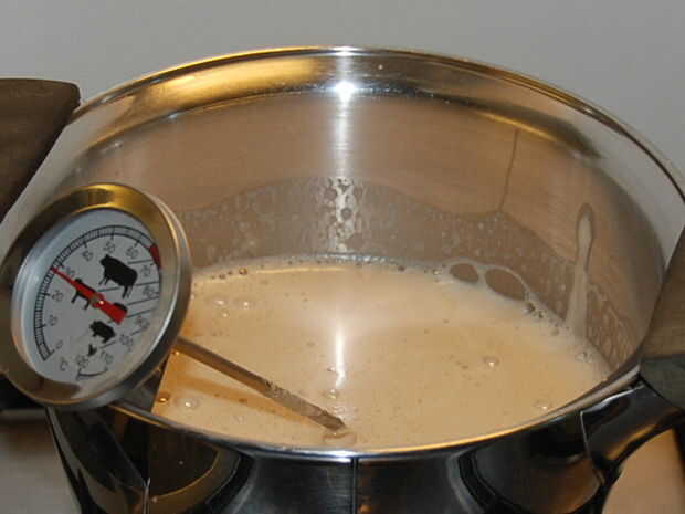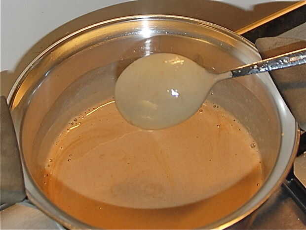 Si no tienes ninguna manera de medir la temperatura, aquí es cómo usted puede decir: Si la mezcla es lo suficientemente gruesa como para cubrir la parte posterior de una cuchara mientras que sacarlo de la mezcla, está listo.