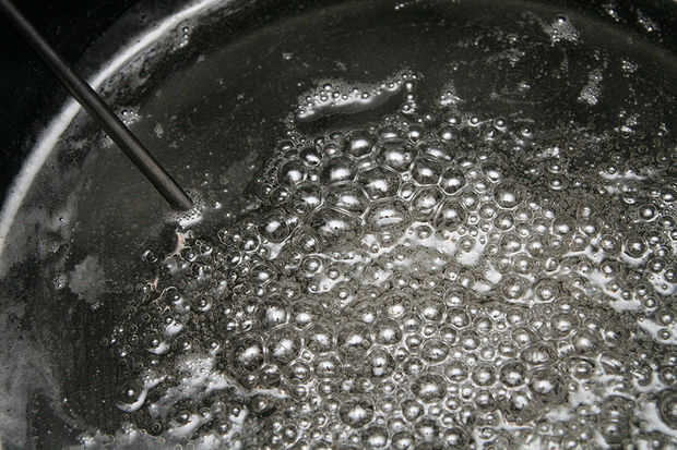 Mientras se cocina es útil cepillo hacia abajo los lados de la cacerola con una brocha de cocina mojado para ayudar a eliminar los cristales de azúcar que pueden haber pegado.