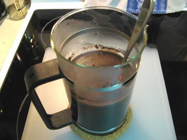 En una cacerola, llevar el agua a ebullición a y agregue el café molido y especias (si se desea). Retirar del fuego y verter en prensa de café, o tapar y dejar en la parte superior de la estufa si se usa un colador para drenar (siguiente paso).